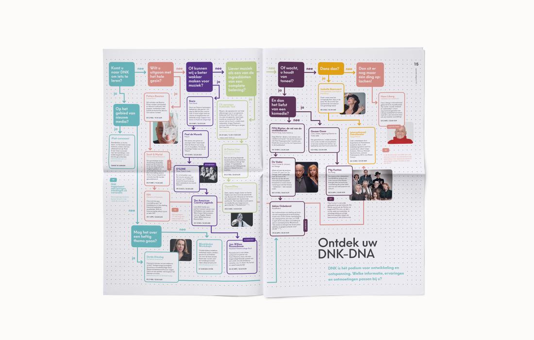 Er was behoefte aan een visuele identiteit waarin hun diverse aanbod, namelijk theater, bioscoop en bibliotheek, goed naar voren kwam. Studio Neon heeft de identiteit ontworpen die deze verbindingen mogelijk maakt. Het heeft geresulteerd in een grid van stippen die je makkelijk met elkaar kunt verbinden. Het custom made lettertype is eigenwijs en duidelijk te herkennen als DNK.